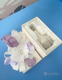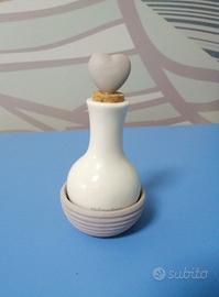 Confezione regalo contenente una piccola bottiglia in porcellana con ciotolina salva goccia Claraluna. Può essere utilizzata per abbellire la tavola, il salotto, una vetrinetta. La bottiglia è alta (senza tappo) 9 cm e porta sopra un tappo di sughero con un cuoricino di porcellana. Utilizzabile anche per olii aromatici. Bella sia da tenere in cucina che come oggetto d'arredo per una vetrinetta. Viene venduta nella sua scatola originale. Ottima idea regalo.
