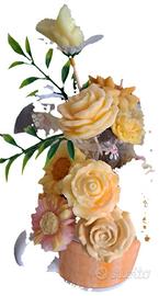 Bouquet di 12 candele artigianali a forma di fiore, realizzate a mano in cera di paraffina colorata. Fiori inclusi: 3 girasoli, 3 margherite bianche, 3 rose crema, 1 gerbera rosa/pesca, 1 fiore bianco, 1 farfalla. Tonalità giallo, crema, bianco con tocchi pesca. Contenitore: Tazza mug in ceramica color pesca con tulipano rosso stampato e manico bianco. Misure: H totale 22-25 cm, tazza Ø 10 cm. Utilizzo: Centrotavola o idea regalo. Ogni fiore è una candela funzionante con stoppino. Profumazione personalizzabile. Fatto a mano