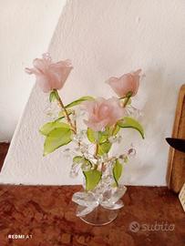 bouquet con tre boccioli di rose rosa, foglie verdi in cristallo, sostenute da piedistallo. I boccioli possono essere aperti o chiusi a piacimento e sul piedistallo vi è un bollino con