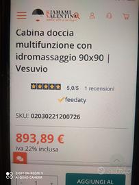 Vendo box cabina doccia multifunzionale 90/90 con idromassaggio e musica ,doccione centrale a soffitto, doccia saliscendi, rubinetteria,6 getti idromassaggio dorsale, sedile, mensola porta oggetti, pavimento antiscivolo, specchio (che si e staccato/crepato in tempo di smontaggio, recuperabile con piccola spesa su internet).Chi e interessato li posso mandare anche un video con il prodotto prima di essere smontato. Prodotto usato ma ben tenuto,smontato già.Pronto a essere ritirato . Vendo per cambio progetto .Non spedisco