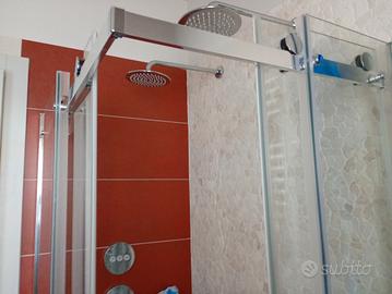 BOX doccia in cristallo 8mm senza cornice con apertura su due lati, vendo causa cambio tipologia, solo ritiro a mano zona Salò. Di seguito descrizione del produttore: BOX DOCCIA RETTANGOLARE • Cristallo temperato trasparente 8 mm • Dimensioni disponibili: cm 70x90, 70x100, 70x120, 80x100, 80x120 • Altezza: cm 190 • Apertura angolare • Trattamento anticalcare • Telaio in alluminio anodizzato, regolabile da 1 cm in meno ad 1 cm in più per lato • Profili estensibili che consentono di eliminare eventuali fuori squadro • Maniglie in acciaio cromato • Ante scorrevoli su cuscinetti cromati • Guide inferiori sganciabili per permettere le operazioni di pulizia e manutenzione • Guarnizione di tenuta ad aletta tra vetri fissi e scorrevoli • Chiusura magnetica • Installazione reversibile: il box doccia si può montare indifferentemente sia nella versione destra che in quella sinistra