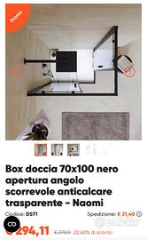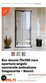 Buongiorno causa odine errato vendo box doccia 70x100 alluminio opaco nero, maniglia nera, vetro temperato anticalcare 6mm, sgancio rapido per pulizia facilitata, chiusura magnetica, apertura doppia scorrevole, dimensione entrata 44 cm, profondita’ massima 73,6 cm, larghezza massima 103,6 cm. Gli imballi sono quelli originali solo aperti e richiusi.Ritiro a carico dell’acquirente.