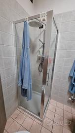 Box doccia ad angolo composto da lato fisso e lato con porta a battente in vetro da 6 mm. Il box è della TDA modello DADO MAXI. Il box risulta già smontato