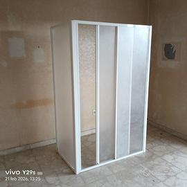 Funzionante, usato e in buone condizioni box doccia angolare con porta scorrevole misure 117 cm x 68 cm. larghezza entrata 50 cm. Completo di tutti i suoi accessori, vetri in plexiglass opachi. Colore Bianco