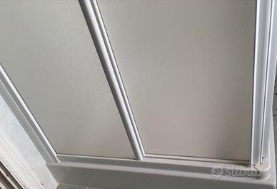 Vendo box doccia angolare con struttura in PVC bianco e pannelli in acrilico/polistirolo ad effetto opaco (finitura "goccia" o satinata), ideale per chi cerca una soluzione pratica e duratura.