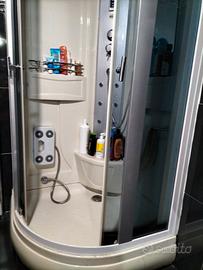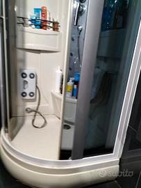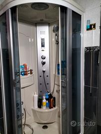 Box doccia idromassaggio angolare in ottimo stato e parte superiore chiusa. È dotata di display, radio, luci emozionali, telefono. Deviatore per doccione superiore, doccino manuale, idrogetti cascatina e massaggio plantare. Porte di vetro temperato con profili cromati. Misura 90x90x200 a parte la copertura. Ritiro a mano da parte dell'acquirente. IL BOX È GIÀ SMONTATO. Si valutano offerte da 100 in su.