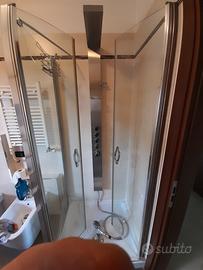 Box doccia angolare in vetro e alluminio, apertura frontale con doppia anta battente, vendo completo di pannello doccia (soffione e 4 getti). Misure: 90 cm di larghezza, 70 cm di profondità