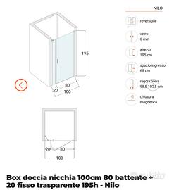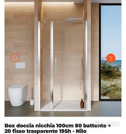 Causa errato acquisto, vendo ancora imballato box doccia nicchia misure 100 (80+20) X 195h come da foto, in vendita sul sito Deghi a 212€. Non spedisco
