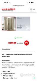 Causa errore acquisto per misura, vendo box doccia semicircolare in cristallo da 6 mm NUOVO misure 90x90x195. L’acquisto è stasto fatto il 27/12/2025 per un costo pari a 299 euro. Si vende a 200 euro per recuperare le spese. Ricevuta di acquisto disponibile