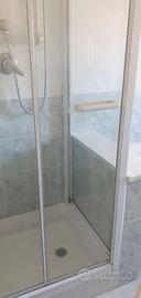 Vendesi box doccia in alluminio colore bianco con lato fisso larga cm. 68 e porta scorrevole con apertura a soffietto larga cm. 84. Le misure possono aumentare o diminuire di circa cm. 2 poichè nella barra che si avvita al muro vi è questa possibilità.