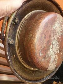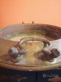 Antico grande braciere in rame e ottone mancante di una maniglia non lucidato per non perdere la patina originale, misure cm. 50 x h 12.