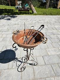 Il braciere è completo del suo supporto originale in ferro battuto, lavorato artigianalmente con motivi a ricciolo, alto 65 cm.