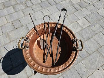 Includo nel pacchetto secondo piatto di raccolta brace e set di attrezzi originali dell’epoca, in ferro battuto, perfettamente in linea con lo stile e la funzione del braciere.