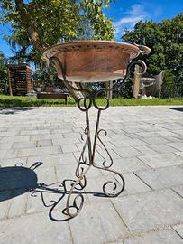 Il braciere è completo del suo supporto originale in ferro battuto, lavorato artigianalmente con motivi a ricciolo, alto 65 cm.
