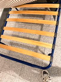 Brandina x ospiti ikea 80x1,90 cm si chiudete ed è molto stretta occupa poco spazio . Struttura con doghe , e piedini a ruote . Unica pecca si è scucito la stoffa che copre il materasso . Si puo cucire tranquillamente o mettere solo un lenzuolo sopra .