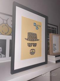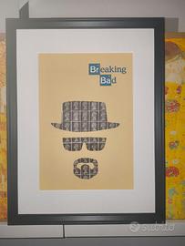 Quadro con sagoma di Walter White di Breaking Bad, intagliata su carta di lino con tramatura telata certificata FSC, su veri francobolli inglesi raffiguranti la regina Elisabetta II.