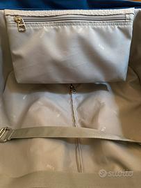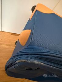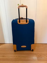 Valigia Trolley grande in tela azzurra con dettagli in pelle. Tasca esterna / tasca porta abiti con gruccia e busta porta scarpe. Altre tasche interne Lucchetto con doppia chiave Piccoli segni di usura visibili in foto 78 x 48 x 27