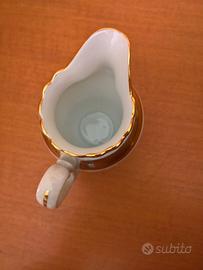 Bricco da latte in porcellana Bavaria Tirschen, con decori in oro brillante e lucido, stile romantico. Ben conservato è perfetto come oggetto da collezione o per dare un tocco raffinato alla tavola. Altezza 9 cm. Nota: nel mio profilo trovi anche la teiera coordinata dello stesso servizio, venduta separatamente. Prezzo leggermente trattabile.