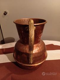 Brocca in rame con rifiniture martelkate e manico in ottone. diametro cm 10 altezza cm 18