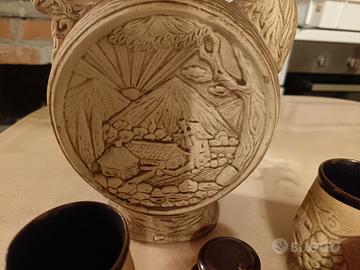 brocca in terracotta internamente smaltata con bicchieri e tappo in ottime condizioni