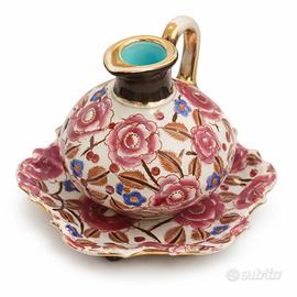 Elegante brocca in ceramica con piatto coordinato della manifattura Boch Frères Keramis, La Louvière (Belgio). Corpo globulare con manico curvo e ricco decoro floreale policromo nei toni del rosa, blu e marrone su fondo avorio, impreziosito da dettagli in oro e interno smaltato color turchese.