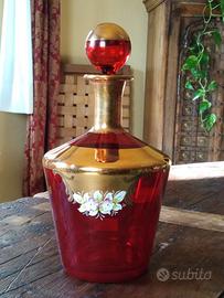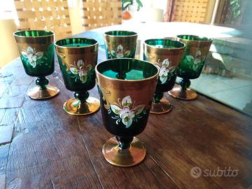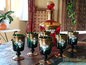 Bellissima brocca in vetro di Murano con sei bicchieri decorati in oro e motivi floreali dipinti a mano.