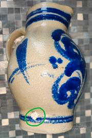 Si segnala un piccolo difetto di decorazione nella parte bassa (cerchiato in verde) a mo' di macchia bianca tondeggiante che - lo si precisa - non è assolutamente una scheggiatura e l'interno della brocca grezzo (vedasi foto).