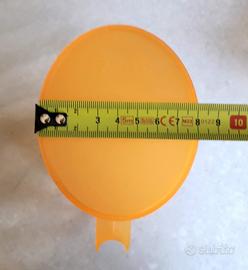 Brocca, con coperchio a doppia apertura, e 4 bicchieri in plastica arancione. I bicchieri si ripongono nella brocca, che è di forma ovale a misura di frigorifero. Nuovo senza scatola.