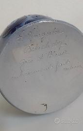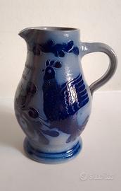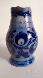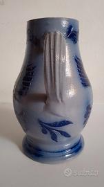 Brocca in gres vintage proveniente da Betschdorf in Alsazia, Francia. Interamente fatta a mano e decorata con la tipica tecnica dello smalto al sale. Il gres al sale è una tecnica di vetrificazione secolare. Durante la cottura sulla fiamma a 1250°C, il sale viene proiettato nelle aperture del forno previste a tale scopo. I vapori di sodio permeano quindi l'argilla e si legano alla silice presente in essa. Il risultato è un leggero strato di vetro, dall'aspetto leggermente granuloso, che ricopre l'interno e l'esterno della ceramica. La vetrificazione al sale produce un coccio inalterabile e impermeabile, che lo rende un ottimo vasellame da conservazione. Il vaso è in perfette condizioni ed è firmata dall'artista. Ha una scritta sulla parte frontale in francese: "Il vino dissipa la tristezza". Altezza 20 cm, circonferenza 40 cm. 800 g, 1 litro abbondante.