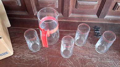 Brocca in vetro + 4 bicchieri Vintage Con manico in plastica E rifiniti col bordo in rosso Tutto nuovo Mai utilizzati Ancora nel suo imballo