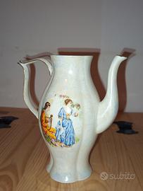 Questa brocca in porcellana presenta una finitura a lustro madreperla e una decorazione con scena galante, uno stile reso popolare dalle opere dell'artista Angelica Kauffman.