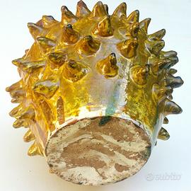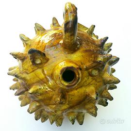 Maschere atropaiche che di base tenevano lontani gli spiriti maligni e venivano donati ai novelli sposi per proteggere le loro case. Questo è un riccio giallo che aveva anche una funzione propiziatoria e iniziatica, di fertilità, visto che gli irti aculei evocavano l'atto sessuale. Apprezzato e fonte d'ispirazione per generazioni di artisti e ceramisti.
