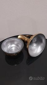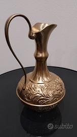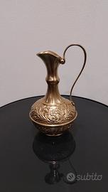 Elegante brocca ornamentale in METALLO lucido DORATO, realizzata con una ricca decorazione a motivi floreali sul corpo. La forma slanciata, con collo affusolato e bocca sagomata, richiama gli stili tardo-Ottocento / primo Novecento, tipici degli oggetti da arredo destinati a tavoli da salotto, ingressi o toilette signorili. Il manico arcuato, modellato con una curva morbida, completa il profilo e conferisce alla brocca un carattere decorativo raffinato. La superficie presenta una patina calda e uniforme, non trattata di recente, che ne evidenzia l’autenticità.La base presenta una linea orizzontale ed è apribile, caratteristica tipica delle brocche decorative che fungevano da contenitori nascosti. Questo dettaglio, spesso assente nelle riproduzioni moderne, la rende un pezzo più ricercato e funzionale. Il manico arcuato completa la silhouette con un tocco elegante; la patina calda dell’ottone ne sottolinea autenticità e carattere. Possibili utilizzi originali e moderni Contenitore nascosto (monete, piccoli oggetti, ricordi) Decorazione d’interni per ingressi, salotti, vetrine Oggetto scenografico per foto, allestimenti o ambientazioni vintage Brocca decorativa su toilette d'epoca Complemento per arredo boho/chic Regalo da collezione Perfetta per collezionisti, interior design, scenografi o chi cerca un oggetto decorativo dall’aspetto antico e solido.