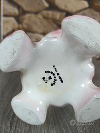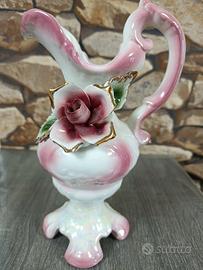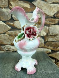 Vaso a forma di brocca in porcellana vintage, caratterizzato da una finitura iridescente (lusterware) e decorazioni floreali a rilievo. Design retrò, anni 50. Ottime condizioni. Oggetto da collezione o da abbellimento