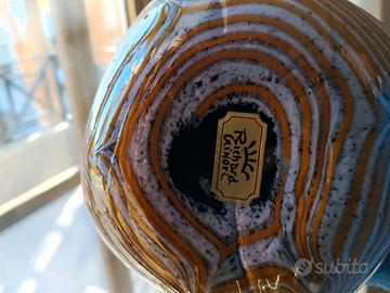 Splendida brocca artistica in ceramica smaltata, alta circa 30 cm, dal forte impatto decorativo e scultoreo. L’opera presenta un elegante decoro marmorizzato bianco e ambra con andamento ondulato, arricchito da spettacolari elementi plastici applicati a rilievo in tonalità blu petrolio/iridescenti che avvolgono il collo e scendono armoniosamente sul corpo, integrandosi nel manico laterale.