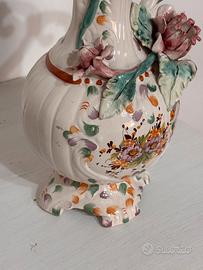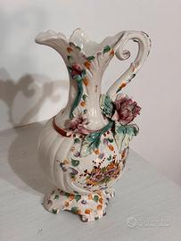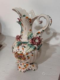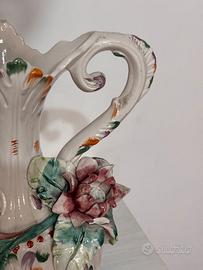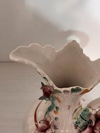 Proponiamo una deliziosa brocca o vaso decorativo in ceramica, un autentico pezzo di artigianato artistico italiano. Questo oggetto si distingue per la sua forma elegante, arricchita da dettagli floreali tridimensionali applicati a mano e da una pittura policroma con motivi floreali stilizzati. Lo stile ricorda molto la produzione ceramica italiana degli anni '50 e '60, spesso proveniente da centri come Bassano o Capodimonte, noti per le loro elaborate decorazioni floreali.