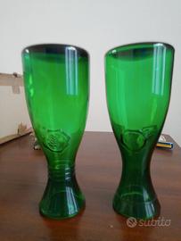 brocche per vino sfuso da osteria, in vetro verde pesante, in ottime condizioni, con simbolo grappolo d’uva nella parte anteriore, risalenti agli anni sessanta.