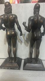 Vendo coppia di statue in bronzo raffiguranti guerrieri in stile classico greco, ispirate ai celebri Bronzi antichi.