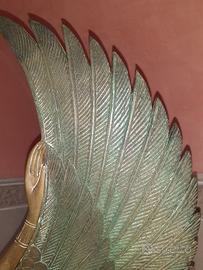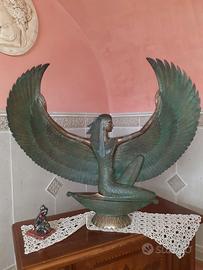 Un capolavoro in bronzo, forgiato con l'antica tecnica della cera persa, che cattura l'essenza della divina Iside. Ogni curva, ogni dettaglio di questa scultura è un omaggio alla maestria dell'artista che la ha scolpita, il noto scultore/pittore A. Baracco, e alla complessità della dea egizia Iside. La dea della fertilità, della magia e della maternità, è rappresentata in una posa che evoca calma e saggezza. Questa scultura è più di un semplice oggetto d'arte: è un invito a riflettere sul profondo significato della mitologia egizia e sulla sua perenne attualità." Pesa a braccio circa 25/30 kg. Le sue dimensioni di ingombro, cm 77 x 77x 30, ben si addicono ad addobbare spazi importanti. Biografia dell’artista: Alfredo Baracco è uno scultore e artista padovano, attivo dagli anni ’50 del ‘900, allievo dal 1952, per cinque anni, dello scultore Paolo Boldrin dove ha appreso varie arti della scultura. Vedi da una delle foto come può diventare d'orata se la si pulisce con della paglietta. Non spedisco, ritiro in loco