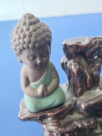 Come da titolo vendo grazioso brucia incenso a forma di piccolo Buddha seduto su una roccia stilizzata. Design unico con effetto cascata di fumo. Realizzato in ceramica con finitura lucida. Ottime condizioni. Misure: altezza circa 12cm, larghezza circa 10cm.