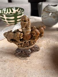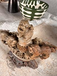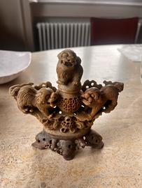 Affascinante scultura orientale in pietra saponaria finemente intagliata e traforata, raffigurante tre leoni Foo (cani di Fo) disposti attorno a un elemento centrale decorativo.