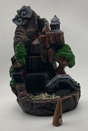 Brucia incensi in resina, per coni a cascata di fumo, immagine zen Giappone, con 3 piani di caduta del fumo, laghetto in basso con ponte ed arbusti, misure cm. 12 x 10 h 17,5.