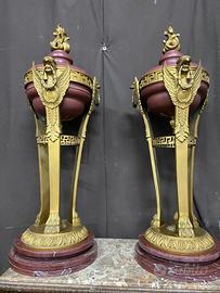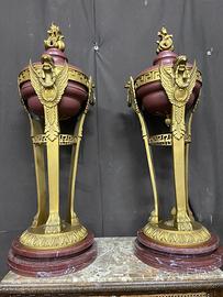 Coppia di eleganti brucia incenso in bronzo con base in marmo collocabili a cavallo tra la fine del XIX Sec. e i primi anni del XX Sec. hanno un altezza di 120cm e la base in marmo ha un diametro di 45cm