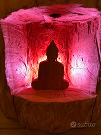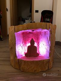 È un ceppo di larice lavorato a mano con la creazione del Buddha. La luce è a led e con l‘applicazione si può cambiare colore e infine in alto c’è l‘entrata per incensi a cascata (i quali darò insieme). Bello sia come arredo sia per chi voglia meditare.