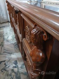 Vendo buffet in noce stile classico con 5 sportelli. Molto particolare con intagli come da foto. Lunghezza cm 270, altezza cm 100, profondità cm 40. € 130. No trattabilità. Trasporto a carico dell'acquirente