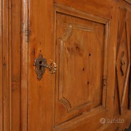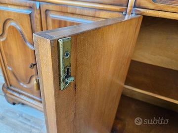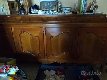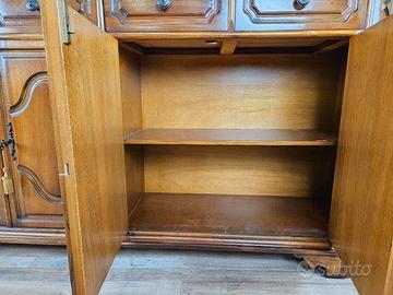 Buffet in noce con intagli e intarsi, rifiniture di pregio; chiavi e serrature originali. Ottimo stato, come nuovo. Lunghezza circa 2 metri. Composto di vani con mensole chiusi da ante. Si valutano offerte, per il ritiro a carico dell' acquirente.