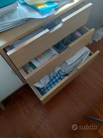 Finitura in rovere, due cassetti e un cassettone, un' anta grigia e un' anta bianca.