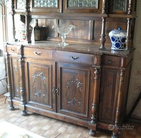 Buffet in noce epoca umbertina (circa 1880) completamente restaurato a doppio corpo (diviso in due pezzi), possibilità di montarlo completo di alzatina e colonne per creare spazio "a giorno" tra i due corpi (altezza circa 2,50cm), oppure sormontando semplicemente i due pezzi (altezza 2,10 circa). vetri a "fondo di bottiglia), interni rifiniti in carta decorata d'epoca. era in origine il mobile espositore di una importante pasticceria/drogheria. Adatto a negozio in stile oppure molto moderno come pezzo di effetto, per libreria o esposizione, oppure come mobile "serveuse" in bar o ristorante. Organizzazione di event. spedizione a carico del compratore.