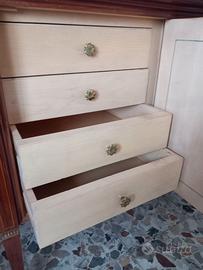 Elegantissimo buffet vintage anni '60 in legno intarsiato, piano in marmo bianco con venature grigie, 2 ante laterali, un'anta con 4 cassetti e 2 ante centrali. Lungh. mt 2,87, largh. cm 51, altezza cm 97. Euro 500.