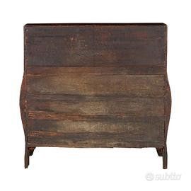 il coperchio cilindrico si apre su un interno dotato di scomparti, cassetti e piano di scrittura rivestito in panno verde, sopra tre cassetti lunghi, su piedi a mensola svasati